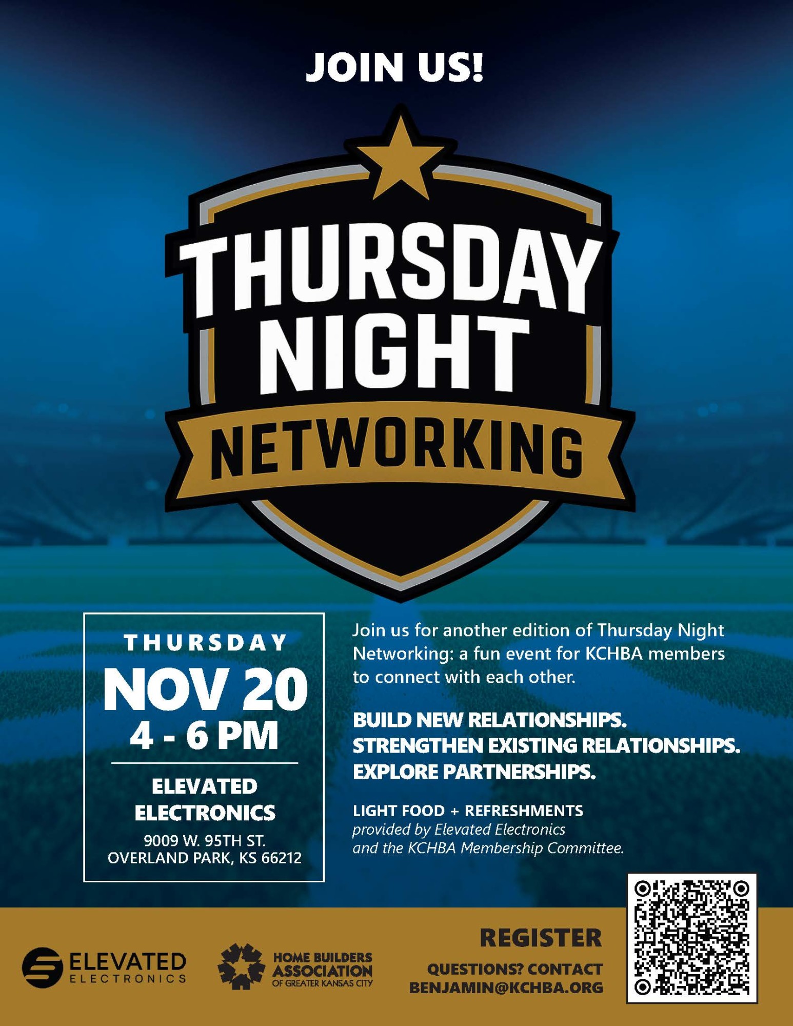 Join us for another edition of Thursday Night Networking: a fun event for KCHBA members to connect with each other. Use this opportunity to build new relationships, strengthen existing relationships, and explore partnerships. Light food and refreshments provided by Elevated Electronics and the KCHBA Membership Committee.